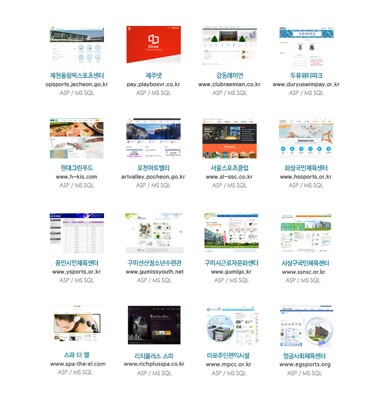 제천올림픽스포츠센터 제주넷 강동래미안 두류워터파크 현대그린푸드 포천아트밸리 서울스포츠클럽 화성국민체육센터 용인시민체육센터 구미선산청소년수련관 구미시근로자문화센터 사상구국민체육센터 스파더엘 리치플러스 마포주민편익시설 엄궁사회체육센터